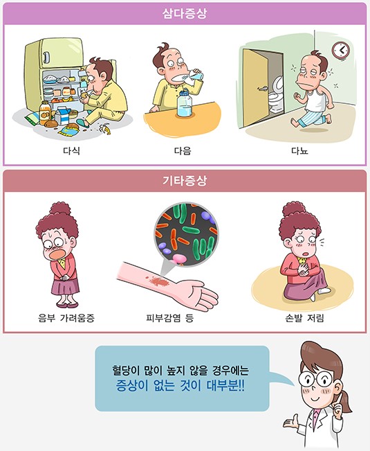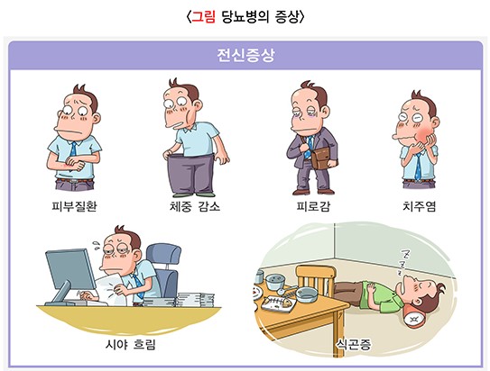 갈증·다뇨·체중 감소·피로·구토 등의 증상을 주요 초기 신호로 제시합니다.